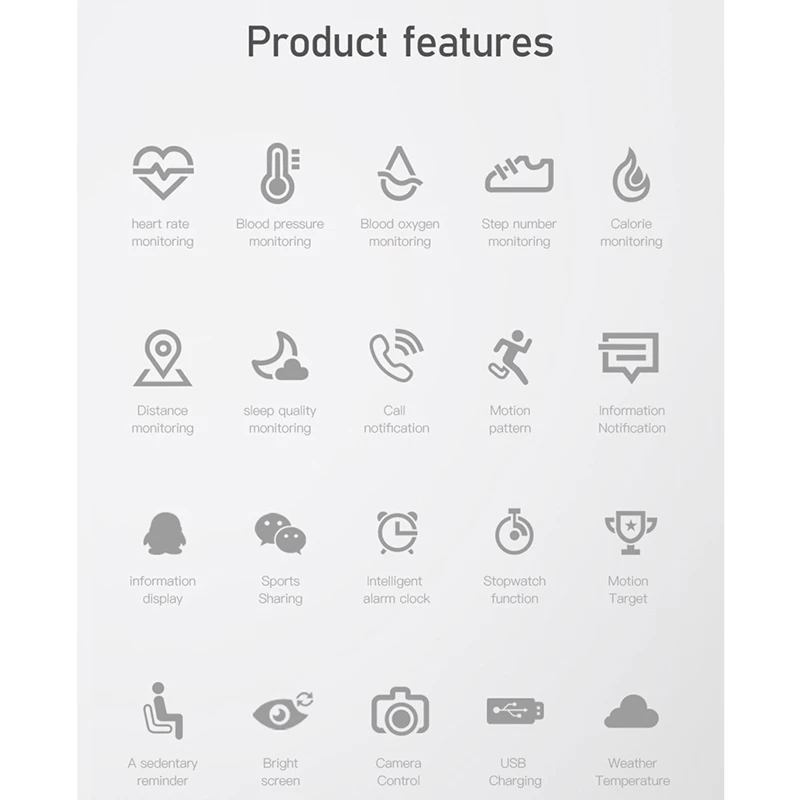 Other Functions: Alarm clock ,Sedentary reminder,Camera remote control,Anti-lost